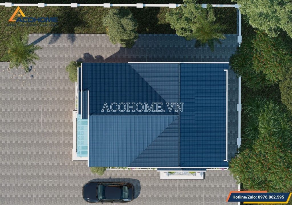 Hệ mái Thái màu xanh dáng chữ A với thiết kế chiều cao 4,4m cùng độ dốc cao làm tăng khả năng thoát nước nhanh, tránh tình trạng ứ đọng, gây rêu mốc cho phần mái làm tổn hại đến tuổi thọ và vẻ đẹp mỹ quan của không gian ngoại thất của công trình. Toàn bộ hệ thống cửa làm bằng cửa nhôm hệ Xingfa cánh kính giúp dễ dàng lấy ánh sáng và luồng gió tự nhiên giúp điều hòa không khí bên trong. Toàn bộ cửa đều được lắp hệ rèm 2 lớp để gia chủ dễ dàng điều chỉnh lượng ánh sáng vào trong nhà phù hợp với các hoạt động bên trong.