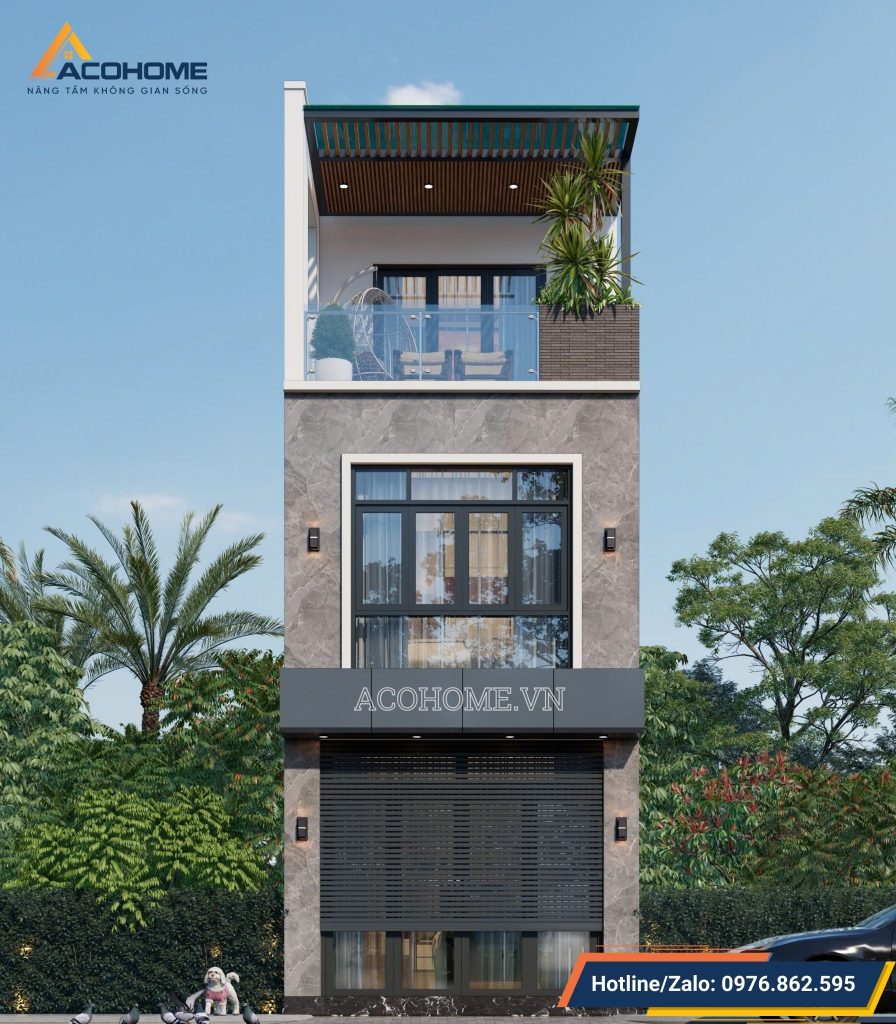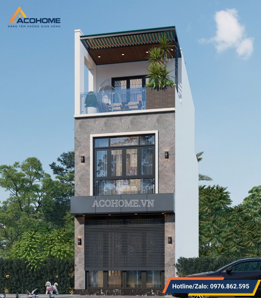 Mẫu nhà phố 2 tầng 1 tum được thiết kế theo phong cách hiện đại với hệ mái bằng mang đến sự trẻ trung, năng động. Kiến trúc sư Acohome đã lựa chọn gam màu trắng, ghi và nâu làm chủ đạo kết hợp các vật liệu trang trí ngoại thất cao cấp như gỗ nhựa Conwood, gạch thẻ inax, sắt hộp sơn tĩnh điện, nhôm xingfa, kính cường lực, đá tự nhiên,… để tạo nên hiệu ứng thẩm mỹ sang trọng, thời thượng cho mẫu thiết kế nhà đẹp này