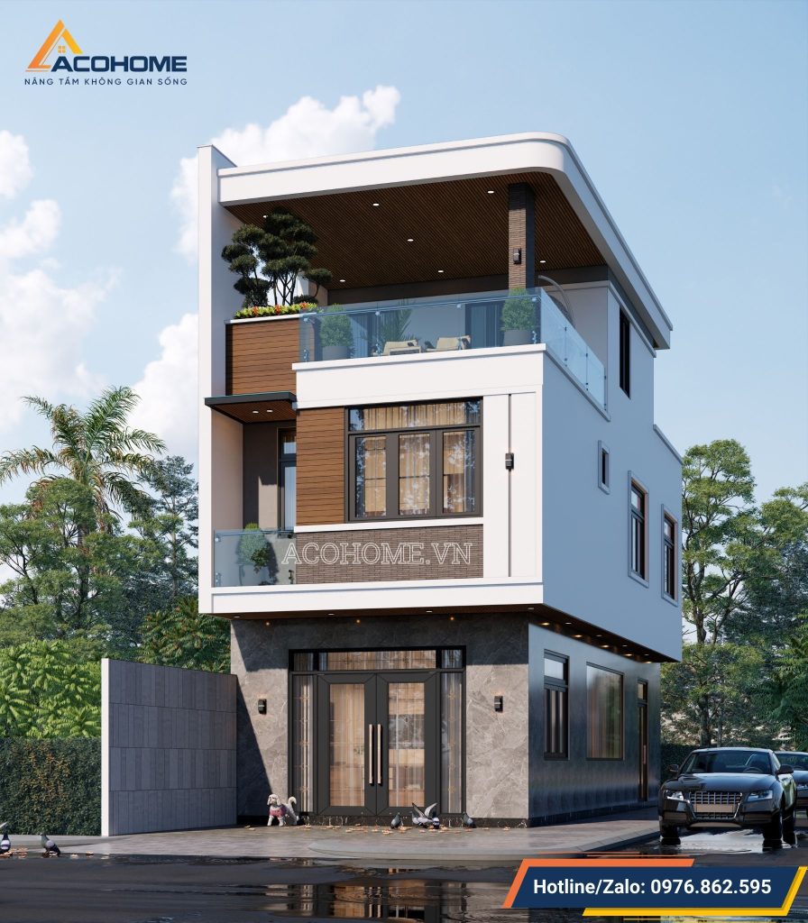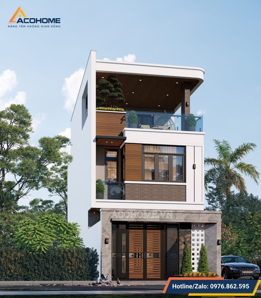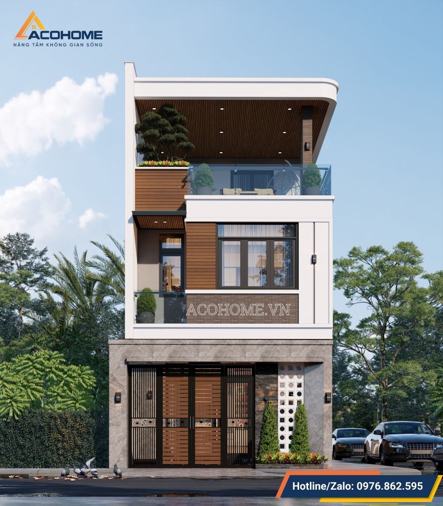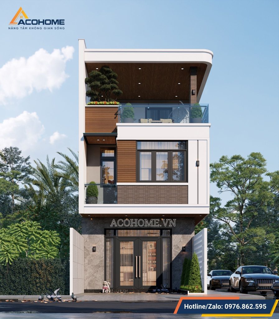 Trong khi đó, tầng 2 được thiết kế nổi bật với sự kết hợp tinh tế giữa gạch inax và gỗ nhựa conwood. Sự kết hợp này tạo ra điểm nhấn độc đáo trên nền sơn trắng, mang lại hiệu ứng thị giác mạnh mẽ, thu hút sự chú ý và tạo ấn tượng ngay từ cái nhìn đầu tiên. Thiết kế tổng thể không chỉ đề cao tính thẩm mỹ mà còn đảm bảo độ bền và tính bảo vệ cho ngôi nhà theo thời gian.