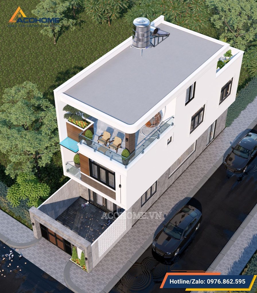 Ngôi nhà ống 2 tầng 1 tum mái bằng hiện đại mang đậm nét thanh thoát và tinh tế trong từng đường nét kiến trúc. Những chi tiết rườm rà đã được tối giản, thay vào đó là sự tập trung vào các hình khối đơn giản, mạnh mẽ. Điểm nhấn ấn tượng nằm ở cách phối màu hài hòa, khéo léo giữa các gam màu tương phản, tạo nên sự thu hút thị giác và cảm giác hài hòa cho tổng thể. Bên cạnh đó, việc sử dụng những vật liệu trang trí mới như kính, gỗ, và đá tự nhiên không chỉ làm tăng tính thẩm mỹ mà còn mang lại nét đẹp sang trọng và thời thượng cho ngôi nhà.