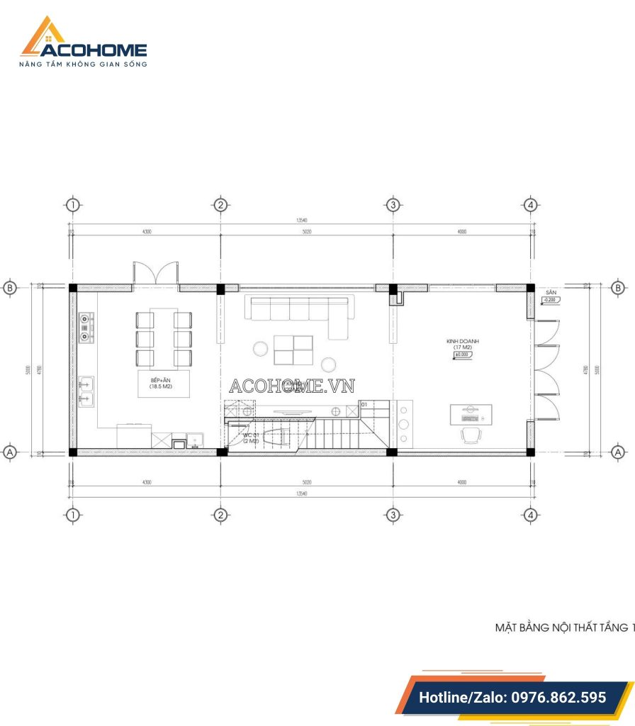 Từ cửa chính bước vào là không gian kinh doanh sau đó đến phòng khách rộng rãi, sang trọng. Khu vực bếp và phòng ăn gọn gàng, tiện nghi được bố trí phía cuối cùng ngôi nhà, tại đây có một lối cửa đi ra phía sau giúp lưu thông không khí thoáng mát.wc chung được bố trí gọn gàng dưới cầu thang để tăng diện tích