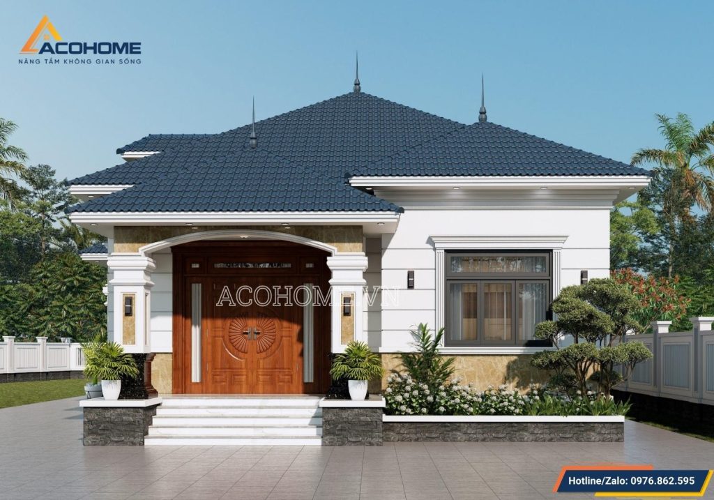 Phần sảnh chính, chân cột được lát đá hoa cương sáng vừa tạo điểm nhấn cho ngôi nhà vừa dễ lau chùi lại rất sạch sẽ, đồng thời giúp cho phần chân tường tránh những tác động bên ngoài. Mẫu nhà 1 tầng mái Nhật mang nét đặc trưng kiến trúc hiện đại với chi tiết các đường kẻ chỉ ngang ở các diện tường mang lại hiệu quả thẩm mỹ cao cho ngôi nhà.