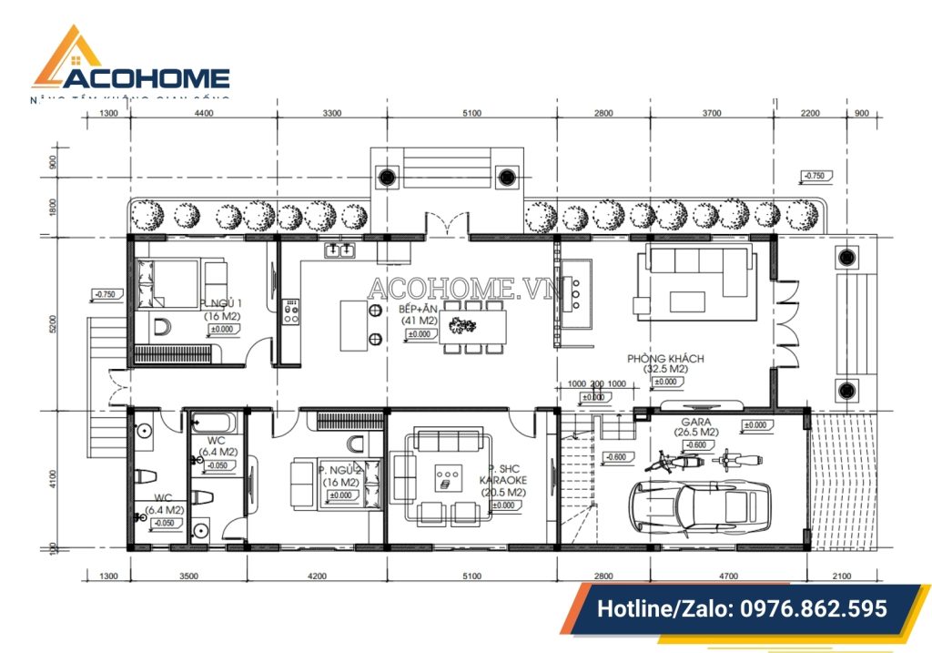 Ngôi nhà sẽ có 2 sảnh là một sảnh chính và sảnh phụ. Khi đi từ sảnh chính vào sẽ đến khu vực phòng khách rộng thoáng, có nhiều ánh sáng tự nhiên. Đối diện phòng thờ là phòng khách là gara để xe oto và xe máy, Từ sảnh phụ vào có thể thông qua khu vực phòng bếp ăn rộng tới 42m2, thuận tiện cho việc di chuyển khi nấu nướng và gia đình có tiệc