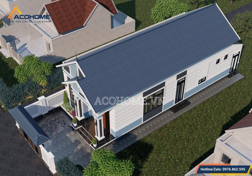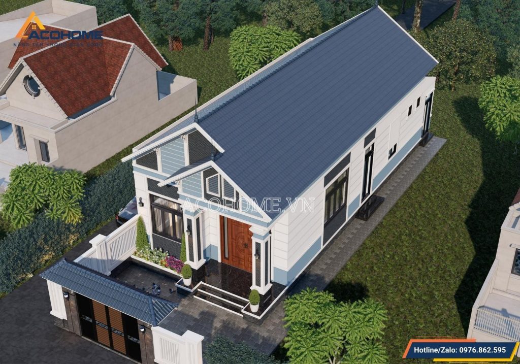 Hệ mái ngói màu xanh đậm thay thế cho hệ mái màu đỏ truyền thống mà chúng ta vẫn thường thấy. Bên cạnh đó, để tôn lên vẻ đẹp của hệ mái ngói các KTS Acohome đã thiết kế loại hình 2 mái chính và mái phụ ở sảnh. Bên dưới có 2 cột trụ to khỏe đỡ cho hệ vòm cong và mái phụ. Tạo nên sự khỏe khoắn cho toàn bộ kiến trúc của ngôi nhà cấp 4 mái Thái.